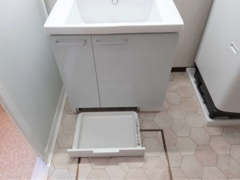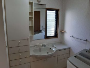 収納とセットになった洗面台が幅いっぱいに設置されていて使い勝手が悪い状態でした。
