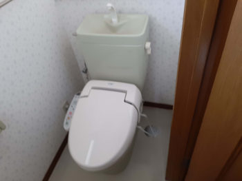 1Fのトイレです。節水型の便器の上に壁付けリモコン式のウォシュレットを設置しました。内装も張り替えました。
