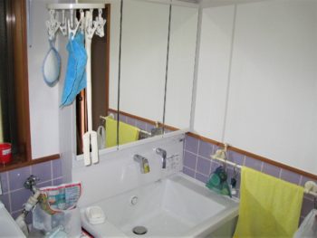 鏡は三面鏡に変えました。鏡裏が収納になっているので、隠してスッキリ見せる事が出来ます。