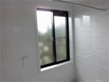 窓は既存ですが、キレイに収まりました。壁パネルはツルツルしているので汚れがつきにくくお掃除が楽になります。