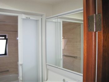 三面鏡の鏡を備え、照明もスッキリしたタイプにしました。鏡裏にも小物がたくさん仕舞えます。
