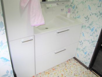 洗面化粧台を取り替えました。ボウルの両サイドに小物を置けるスペースがあります。下の収納は2段の引き出しになっています。