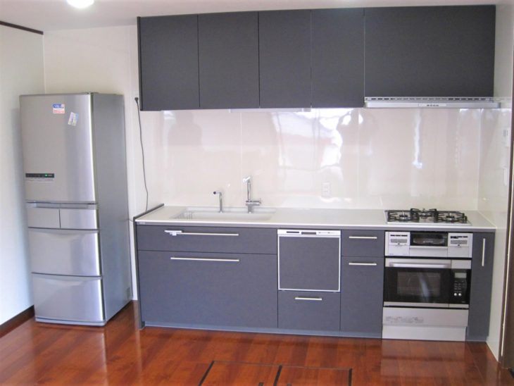 使い勝手のいいシステムキッチンを設置しました。大きなテーブルも収納棚も場所を選ばず設置できるようになりました。