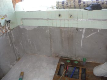 古いキッチンを撤去し、配管をやり直しています。
