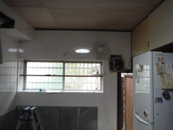 天井のクロスを張るために下地処理でベニヤ板を張っています。