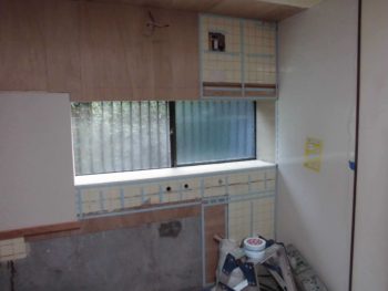壁には掃除がしやすいキッチンパネルを張っていきます。