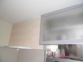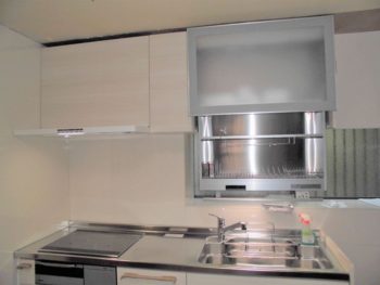 あまり使わない吊り戸部分に昇降式の食器乾燥機を取り付けました。普段は吊り戸部分に納まっているので邪魔にはなりません。