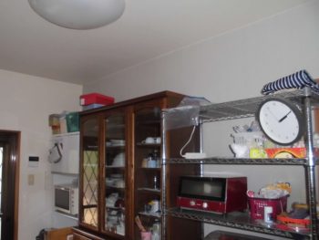 キッチン後ろの収納を取替、天井いっぱいの収納棚にしました。冷蔵庫を隣に据え、使いやすい動線になりました。