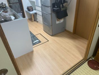 キッチンの床を張替、明るい色になりました。収納を充実させたことで棚などが少なくなりスッキリとした空間になりました。