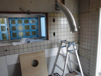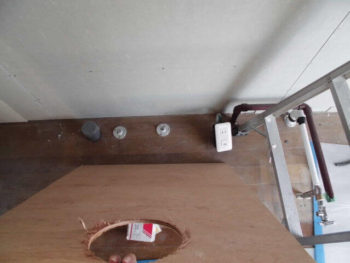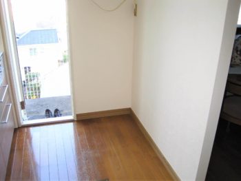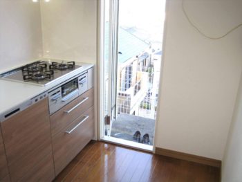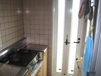 勝手口があるのでシステムキッチンの出幅に注意が必要です。