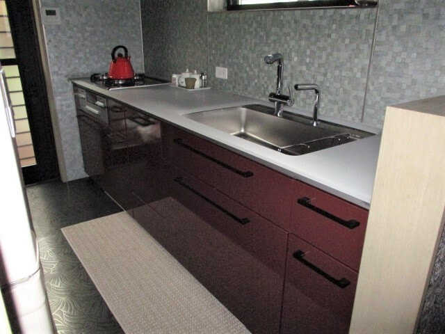 エンジの扉のシステムキッチンに取り替えました。収納は引き出し式なのでたくさん物が仕舞えます。床はフロアタイルを張りました。