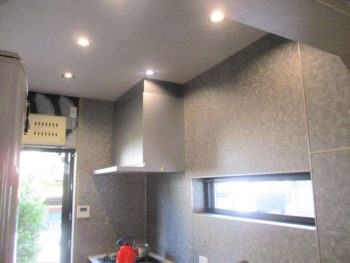 キッチンパネルをグレーにしカッコイイ空間にしました。天井照明をダウンライトにしたことでスッキリした印象になりました。