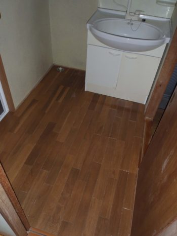 洗面所の床はクッションフロアで仕上げました。水にぬれても浸み込まず、ふき取りがしやすくなりました。