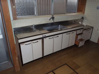 現状壁付けのキッチンでした。開き戸の収納は使い勝手が悪いです。