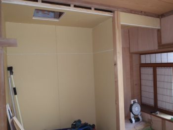 和室の壁にクロスを張るために下地を張っていきます。