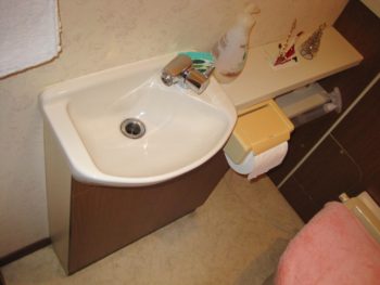 床のクッションフロアの色と手洗い器・カウンターが同系色になり、まとまりのある空間ができました。